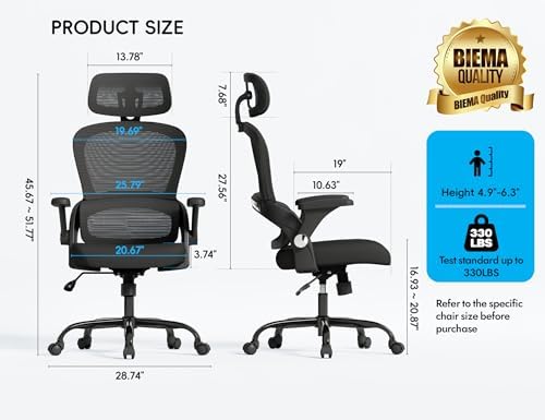 To krzesło oferuje wsparcie pleców dla długich sesji pracy. Szerokie siedzisko pomieści osoby o większej budowie. Poduszka pod głowę redukuje napięcie szyi. Czarna tkanina jest praktyczna i stylowa. Koła pozwalają na swobodne obracanie. Nośność 330 funtów gwarantuje trwałość. Ergonomiczna forma zapobiega bólom. Łatwa instalacja nie wymaga narzędzi. Pasuje do domowego biura lub firmy. Komfortowy design zachęca do produktywności.